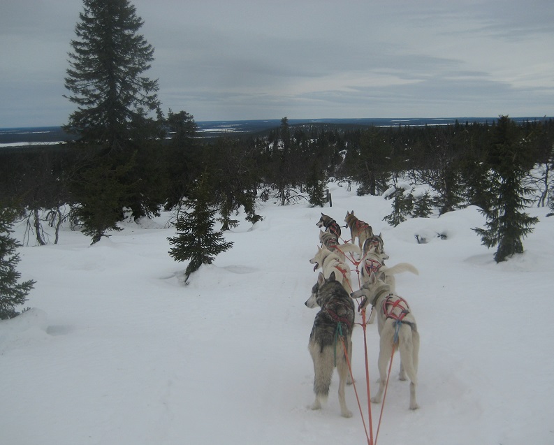 | 30.3 First sled trip on evening after travel to Lapland. Top of Jorpulipää, touristdogs Soyka, Geea, Kaima and Yepla in team. |